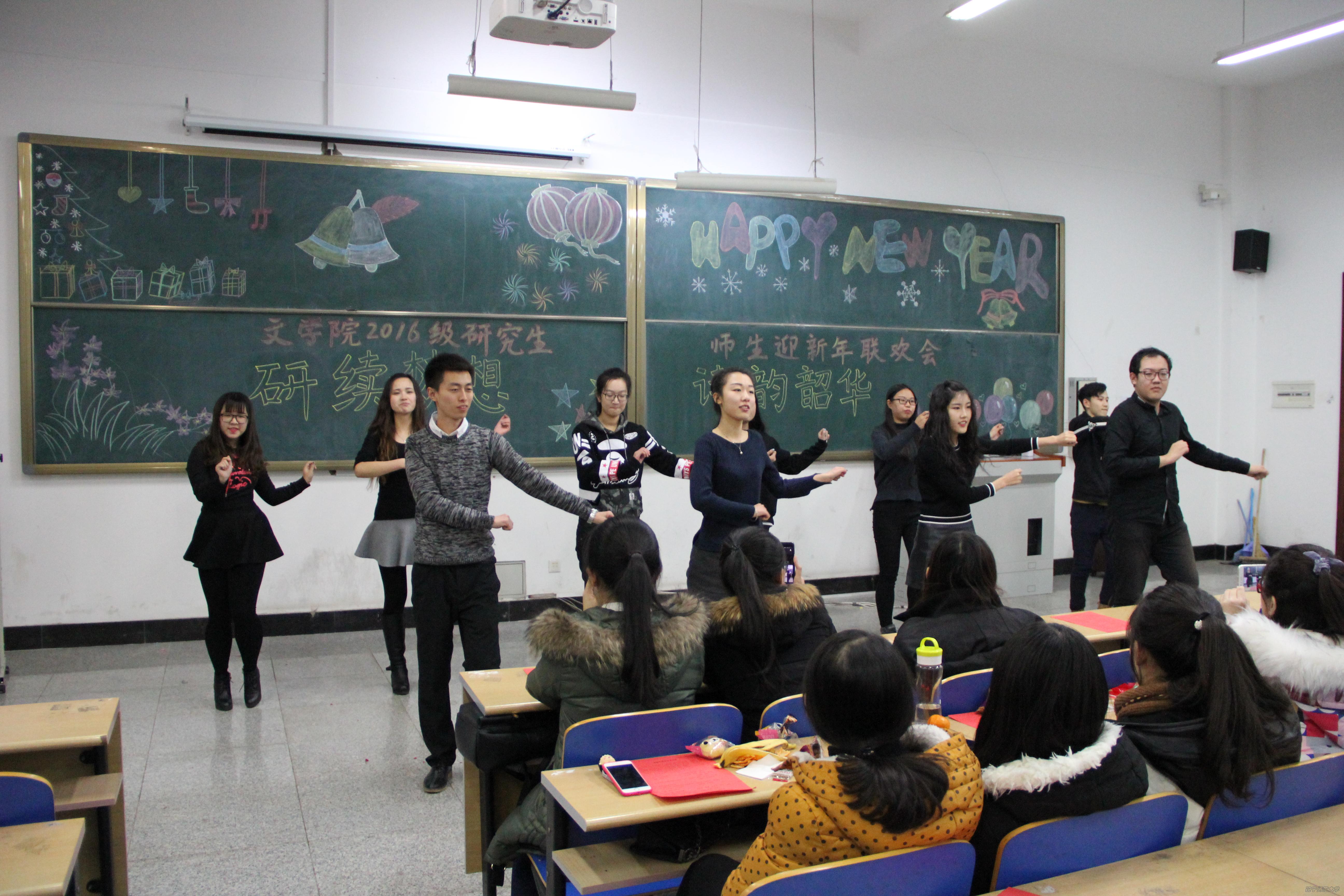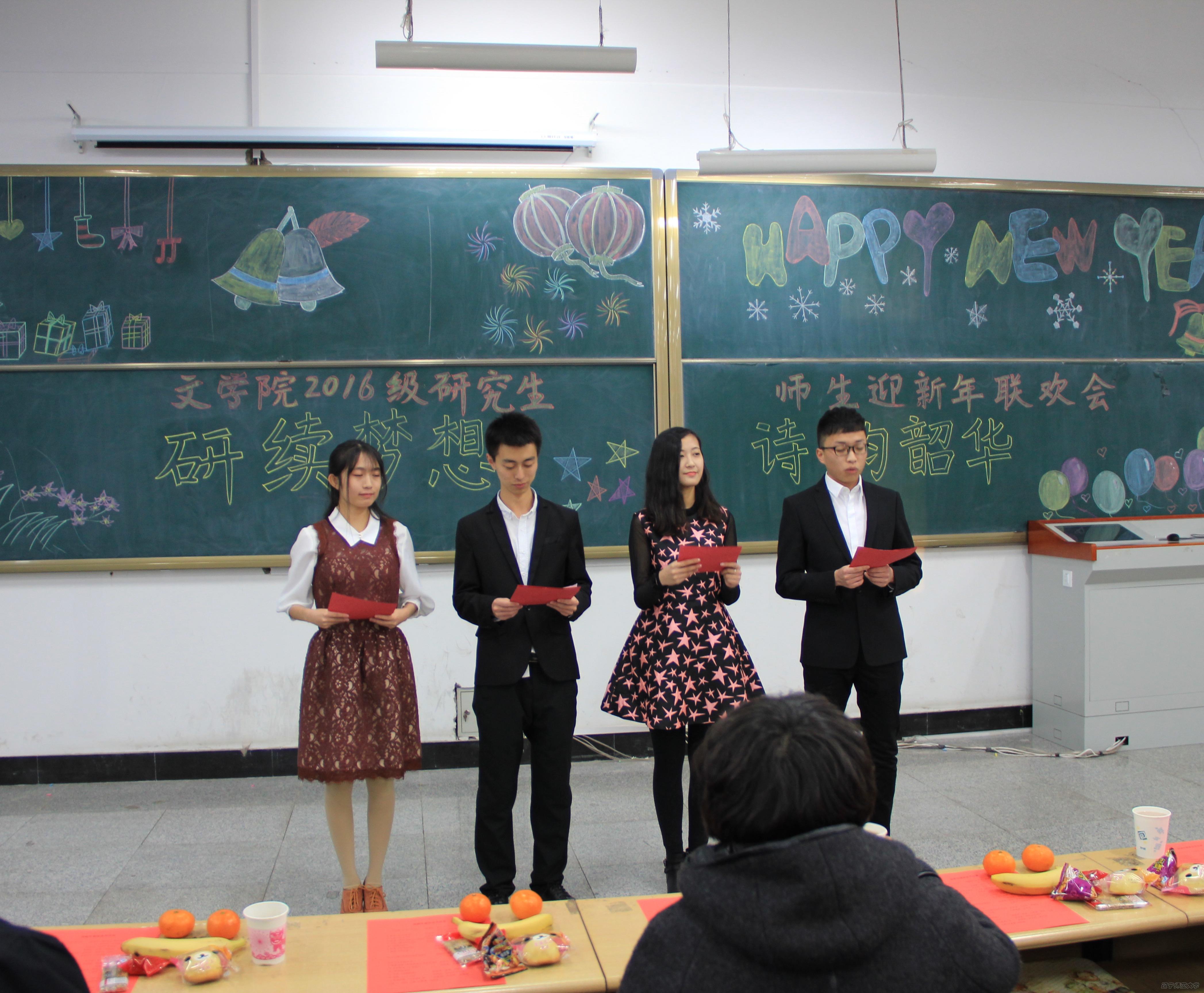 12月23日下午4时,由文学院团委主办的2016级研究生“研续梦想·诗韵韶华”迎新年联欢会在西山湖校区一教202教室圆满举办。文学院党政领导、研究生导师、专业课教师、辅导员老师以及部分教辅行政人员和研一全体同学共同参加了本次联欢会。